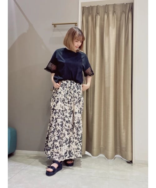 レーススリーブTシャツは、五分袖のカットソーなので腕を出したくない私にどストライクなアイテムです! 柄のスカートもウエストゴムで楽に履けるアイテムですが、ティアードなので、大人フェミニンに仕上がりますよ!