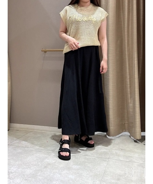 ロゴがお洒落なメッシュニットを使ったコーデです。体のラインを拾いにくいゆったり目のニットです。ボトムスは、動くたびに揺れるのでお洒落!サラッとして涼しいので使いやすいです。シワになりにくいのでお手入れもしやすく、ノンストレスで履いてます。