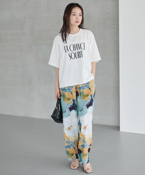 インパクトのあるアート柄が目を惹くイージーパンツ。リラックス感のあるシルエットながら、スタイリッシュに決まる一枚。ウエストは調整可能なリボンとゴム仕様で、快適さとデザイン性を兼ね備えています。