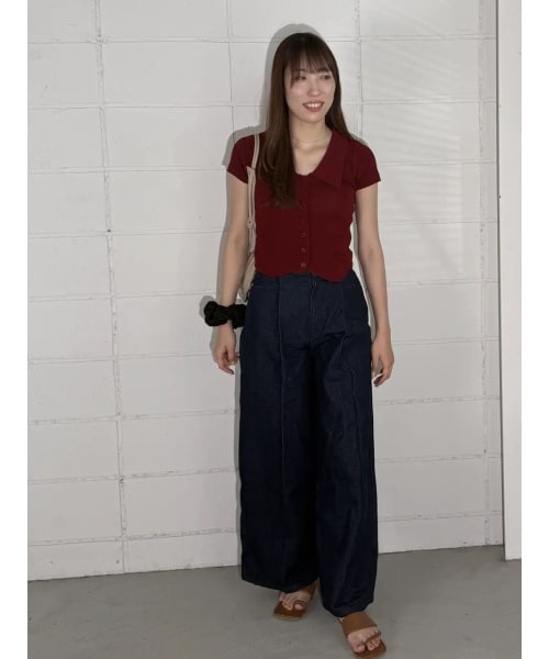 深みの赤ニットトップスがかわいい! 夏はデニムにさらっと合わせてカジュアルに着こなしたいです!