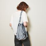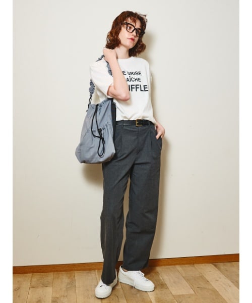 カラ―:グレー シンプルなロゴT×Tタックパンツのきれいめカジュアルコーデに、くしゅっとした質感が魅力のニュアンスグレーのバッグを合わせて、抜け感と柔らかさをプラスするアクセントに。