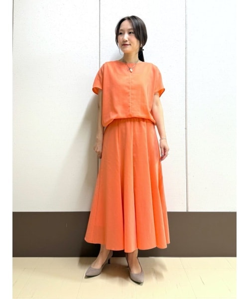 ブラウスはシンプルなデザインで身幅はありますが、コンパクトな丈感なので大きく見えず合わせて頂きやすい一着!スカートは長めのフレアスカート!ウエストゴムで楽に履いて頂け、フレア感が綺麗なスカートです。長めですが軽いお素材で重たく見えません!