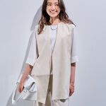 ノーカラーのジレはリネンライクですがポリエステルなのでシワになりにくいです!シャツは着丈に前後差がありオシャレ見えするデザイン!こなれセットアップのワイドパンツはタックなしで低身長さんでもスタイリングしやすく◎