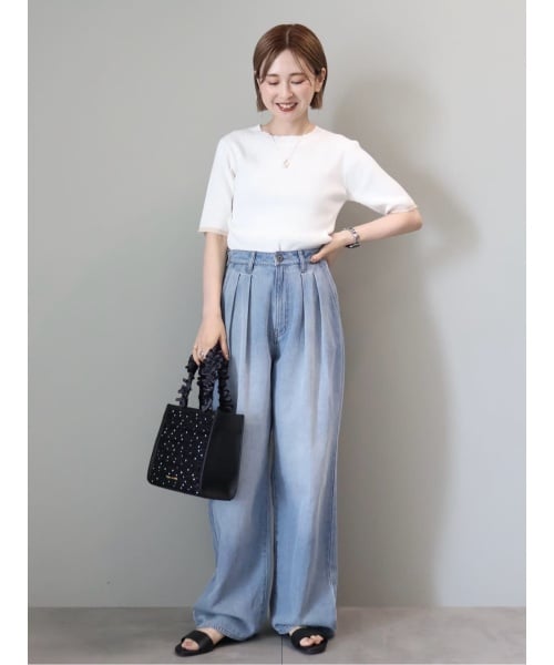 【着用サイズ ニット:M パンツ:M】袖口のバイカラーがかわいいサマーニット。半袖で程よいフィット感。さらりとしたコットン混素材で着心地◎