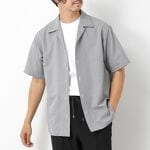 ライトグレーのオープンカラーシャツにブラックパンツを合わせて落ち着きのある洗練された印象のコーディネートです。