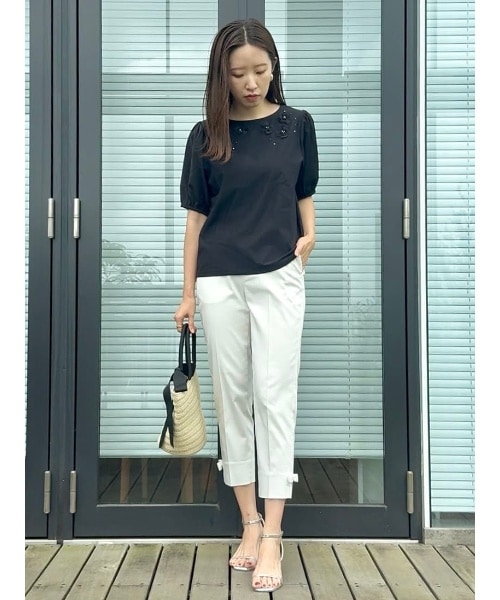 衿元のフラワーモチーフとパールが印象的なトップスは、華やかさと品の良さを兼ね備えた一枚?顔まわりをパッと明るく見せてくれます◎甘すぎないブラックで大人の可愛さを演出♪