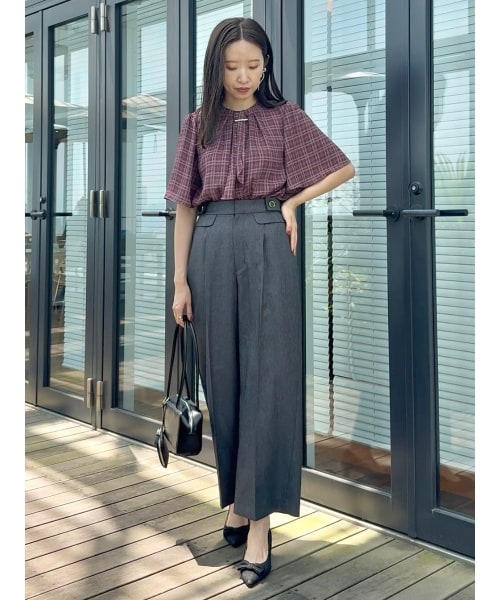 ボルドーカラーのチェック柄ブラウスが秋の先取りムードを演出♪袖のふんわりとしたシルエットが二の腕をやさしくカバーし、柔らかさをプラス!