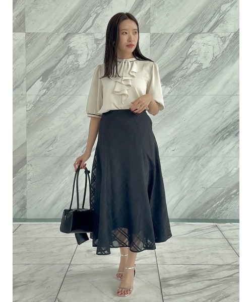 柔らかな光沢感が上品なフリルブラウスは、立体的なディテールで顔まわりを華やかに演出♪ スカートは繊細なチェック柄の透け感がポイント?無地ライクに見えながらも、さりげない柄感でスタイリングに奥行きをプラスしてくれます◎