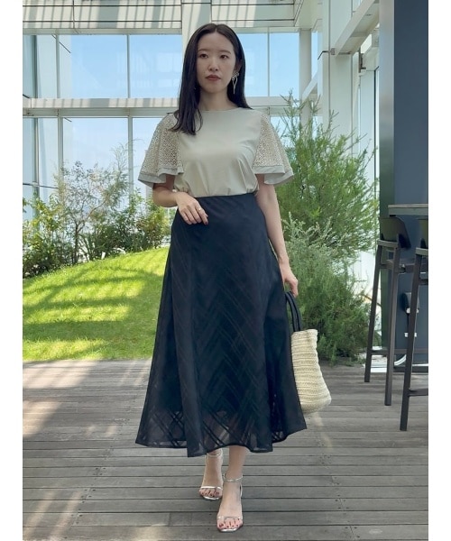 スカートはほんのり透け感のあるチェック柄素材で、軽やかさと奥行きをプラス!動くたびに揺れるシルエットが女性らしさを引き立てます?