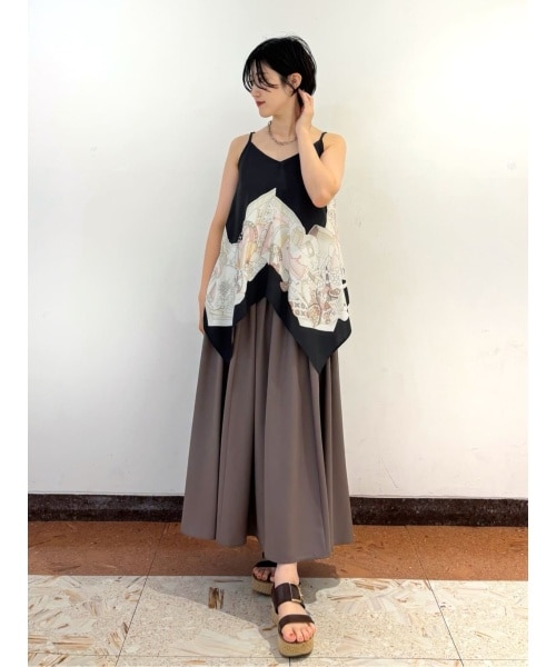 157センチで足首が少し出る着やすい長さのフレアスカート。たっぷり生地を使っていますが落ち感もキレイでヒップ周りの切り替えをこだわりボリュームが出過ぎないシルエットになっています。カーキのような絶妙なチャコールがコーディネートをワンランク上げてくれます。