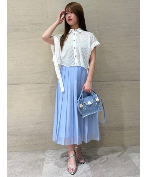 メッシュポンチョシャツはカジュアルになりすぎない綺麗めな雰囲気のアイテム。長めのリボンは、サイドで結んだりそのまま垂らしたりとアレンジ可能です◎