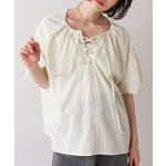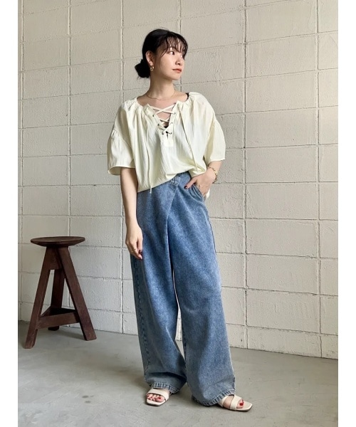 ツヤと独特な生地感が上品なブラウス。 この絶妙なクリームカラーがお気に入りです。レースアップ部分は、ほどいても蝶々結びでも雰囲気が変わって楽しめます!アシメラップデニムは、リアルバイしたほどお気に入り!何にでも合わせちゃう!