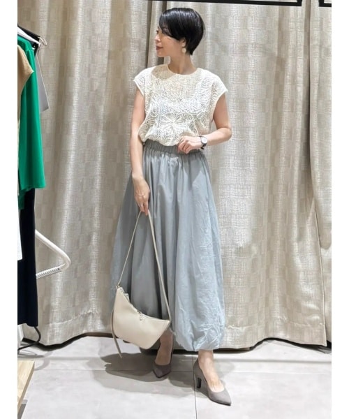 綺麗目トップスにバルーンスカートを合わせました♪ スカートは158センチの私でこの丈感です(^^) シワになりにくい素材でおすすめです!涼しいですよ♪