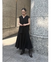 コットンポリエステル素材の張り感のあるシャツブラウスです。シンプルなデザインですが、タックで作られたボリュームスリーブがフェミニンな印象をプラス。インでもアウトでもどちらのコーディネートにも使いやすい丈感で、汎用性の高いアイテムです。