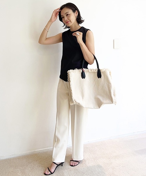 シンプルで上質なウェアをモノトーンで爽やかにまとめました。あとは同系色の小物で色付けするだけで大人のおしゃれコーデが完成です。