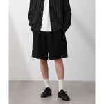 肩のラインがドロップデザインになっているトレンド感満載のシャツを着用したハーフパンツコーデ。