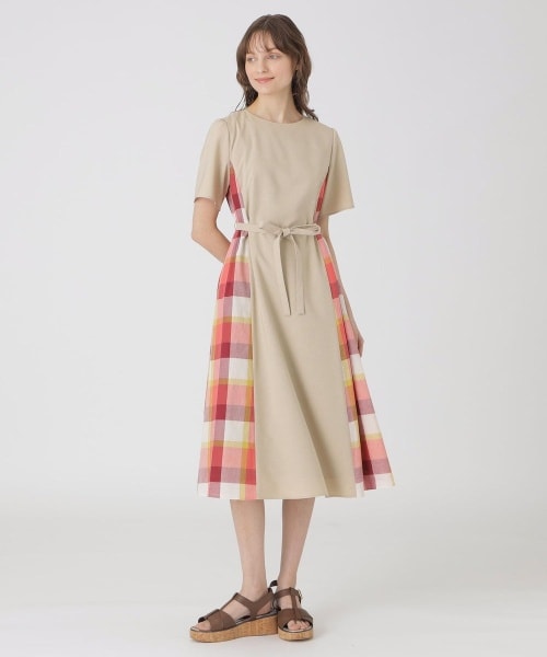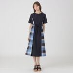 無地×チェック生地の異素材コンビドレスです。付属のリボンでウエストマークしたフィット&フレアシルエットでの着用がおすすめです。ナチュラルストレッチの効いた素材が着心地良く、シーンレスに活躍するアイテムです。
