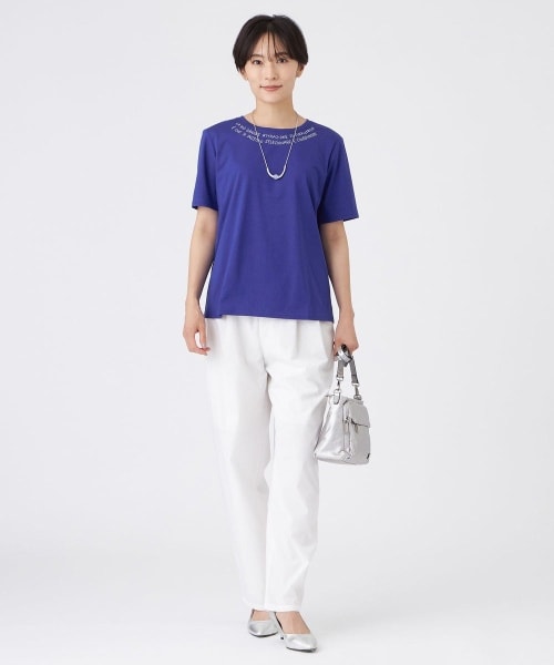 Tシャツはすっきりとしたシルエットです。衿ぐりに沿って入れた、手書き風の刺繍がポイントです。内容は、フラッシャーネームにも書いてある言葉の一部で『EVEX by KRIZIAの最大の魅力は、自由にコーディネートを楽しむことです。』といったニュアンスの言葉が書かれています。