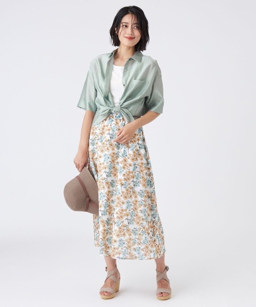 【ブラウス】夏にぴったりな接触冷感機能付きのシアーブラウスです。上品な光沢感と美しい発色が魅力です。【スカート】夏にぴったりな涼しげで華やかなスカートです。ウエストは総ゴム仕様で、着脱がしやすいフレアスカートです。