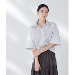 スキッパー衿で抜け感のあるシャツを着用したシンプルカジュアル。