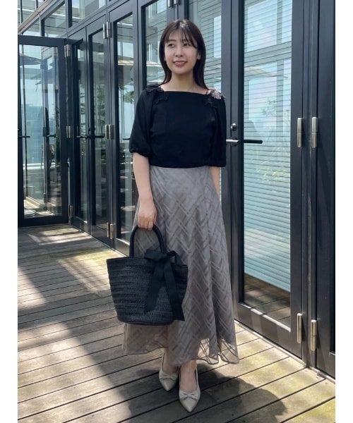 トップスのお花のモチーフがお顔周りを華やかしてくれます! スカートの裾のシアー感が、大人可愛く着映えました!