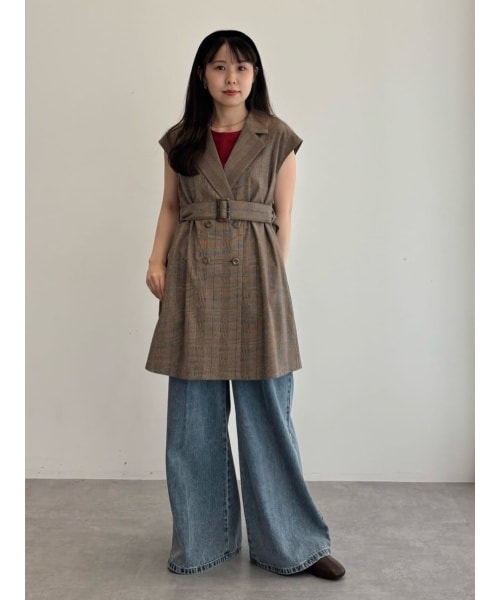【着用サイズ タンクトップ:F ジレンチ:F パンツ:S】ショートジレンチの秋コーデです◎秋見えするチェック柄を選びました!合わせるもの次第で長く楽しめます♪