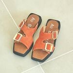 大ぶりなスクエアトゥのサンダルを合わせることでエッジが効いたコーデに。