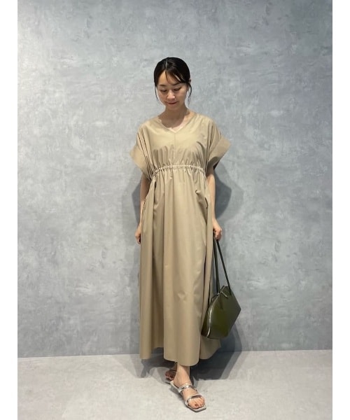ベージュのワンピースにカーキのバッグを合わせて、ナチュラルで上品なスタイルに♪