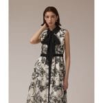 一からオリジナルで刺繍の柄を起こしたデザインのノースリーブワンピース。襟付きできっちり感を出しながらも胸元には柔らかいボウタイをあしらった華やかな1着。ボウタイは取り外し可能です。