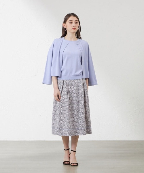 【カーディガン】マットな表面感が特長の肌触りのよい素材となります。接触冷感機能・UV機能のあるニット糸を使用しています。紫外線遮蔽率96%以上です。【スカート】裾が広がりすぎず落ち着いた分量感はすっきりとした印象で着用していただけます。後ろウエストはゴム仕様で柔らかい着心地です。