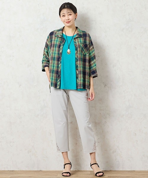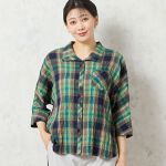 【大きいサイズ】マドラスチェック柄のシャツに同系色のカラーインナーを合わせたコーディネート。きれいな色使いが気分を盛り上げてくれます。