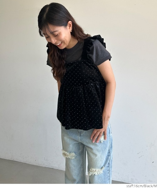 着用サイズ・カラー ■ベロアラメビスチェ M/Black ■フレンチスリーブトップス S/Charcoal ■クラッシュデニムパンツ M/Lt.blue