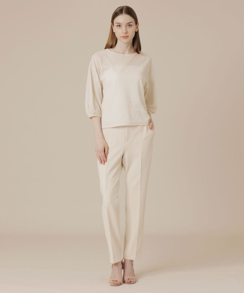 【トップス】綿に極細のナイロン糸を使用し、透け感のあるアーガイル柄をコードレース調に表現したジャカード素材です。【パンツ】裾に向けて細くスッキリとしたラインのクロップト丈パンツです。ゆとりのあるトップスとのコーディネートに活躍します。