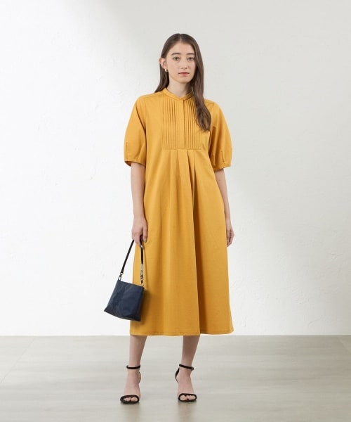 開発素材のブラウジーで、洗濯シワになりにくい布帛見えの素材感を活かし今回はボレロに続きワンピースを開発しました。清涼感があり、着心地が良く、1枚でさらっと着用いただけます。