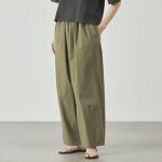 【トップス】カラミ調のカットソー素材を使用したノースリブカットソー。肩にタックを入っていることで、少し肩が隠れるようになっています。【パンツ】綿のようなナチュラルな見え感と風合いを表現した素材です。やや薄手で、程よい反発感としなやかなストレッチ性が特徴。