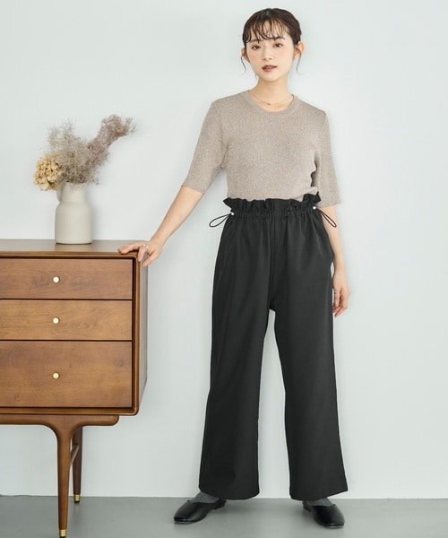 両サイドのコードでシルエットを調整できる、大人可愛いパンツ。メリハリのある着こなしとスタイルアップが同時に叶います。ストレスフリーな穿き心地で、さらりとした素材が上品なムードを演出。シンプルなTシャツを合わせるだけでもサマになる、着回し力抜群のアイテムです。
