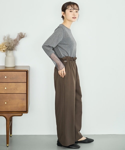 デイリーに寄り添う快適なトップスと、大人可愛いパンツの組み合わせ。メロウ仕上げの袖口とシアー感がこなれ感をプラスするトップスに、サイドのコードでシルエットを調整できるパンツを合わせ、メリハリとスタイルアップを両立。オンオフ問わず活躍する万能なコーディネートです。