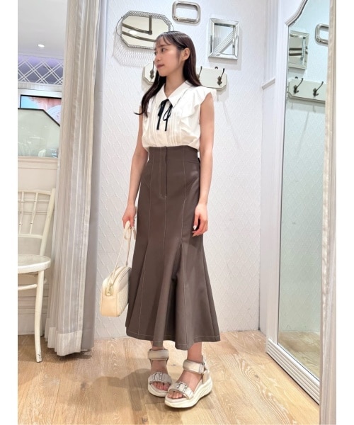 ブラウスとマーメイドスカートを合わせたフェミニンコーデ。 ブラウスの華奢なリボンは取り外し可能で、オフィスやお食事など幅広い場面で着回しできます。