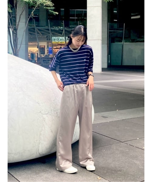 ボーダーニットにサテンパンツでカジュアル過ぎないコーディネートです。パンツも太すぎないワイドパンツなのでコーディネートに取り入れやすいです。