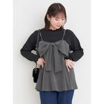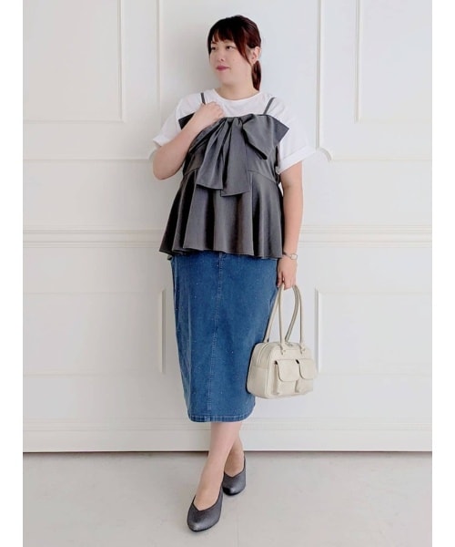 大きなリボンが可愛いビスチェはバストの幅いっぱいの大きめなリボンですっきり見え効果◎! 裾が広がるシルエットで気になるウエスト周りを隠してくれます♪ 後ろはゴムが入っているので着心地も楽ちん!ほどよくタイトなデニムスカートを合わせて、カジュアルガーリースタイルに!