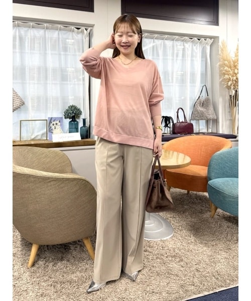 (ニット) シアー感は透けすぎる感じはありません。晩夏〜秋も使いやすいです。 (パンツ) さらっとした表面感でラインが入ったデザインでも、ほんのりきれいめな印象にまとまります
