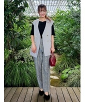 トップスの裾のストライプがポイントになり、足元は黒で引き締めました。