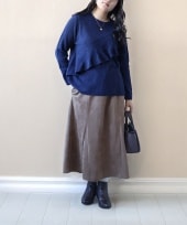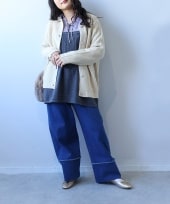 ニット素材のブラウスは、甘めのキャンディースリーブが大人フェミニンな印象。フリルたっぷりのシックな色ノースリブラウスをインナーにし、甘さを抑えたバランスが絶妙です。薄手のデニムでゆるっと着こなしたストレスフリーなカジュアルコーデです。