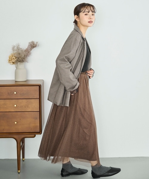 ラメ入りのチュールスカートに千鳥柄チェックジャケットを合わせたプレッピーな秋コーデ。異なる素材感が大人のおしゃれを演出し、ほどよいフェミニンさとこなれ感が魅力です。旅行コーデにおすすめ!