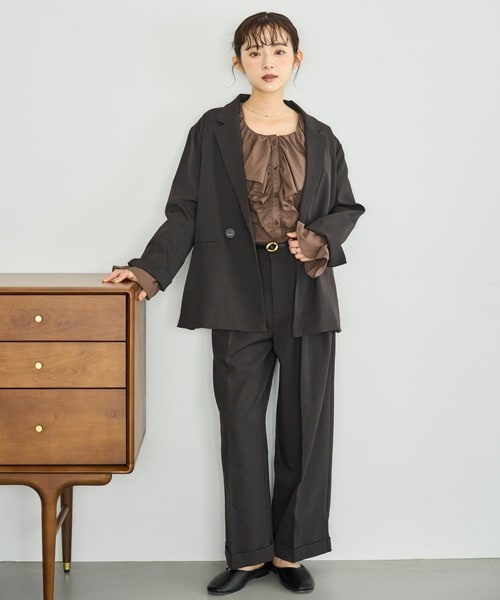 セットアップで魅せる秋のトラッドコーディネート。シックなフリルブラウスがコーデを格上げし、マニッシュな雰囲気の中にも女性らしさをプラス。オフィスやお出かけにぴったりの大人スタイルです。