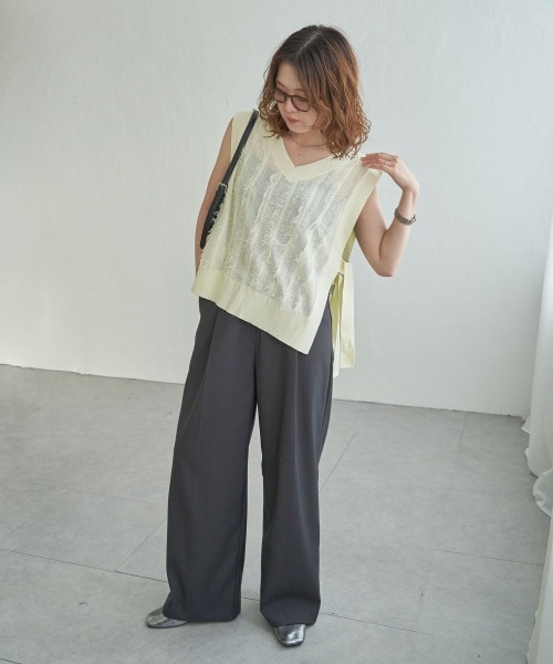 繊細な透け感が魅力のシアーニットに、さりげないフリンジ使いで表情を添えたフリンジシアーサイドリボンベスト。 オープンなサイドリボンデザインで、インナーや腰回りを気にせずラフに着られます。
