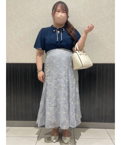 ボウタイブラウスは、スカートに合わせるとキレイめのお出かけスタイルに◎首元のリボンやメタルパーツを外しパンツと合わせると、オフィスコーデとしても着ていただけます♪マーメイドスカートはラメの花柄刺繍が上品に写真映えします♪後ろにゴムが入っているので楽ちんで動きやすいです!