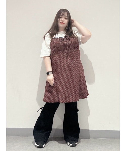 チェック柄とリボンがかわいい、キャミチュニックワンピース!太ももまで隠れるほどよい丈感が◎ 合わせるインナー次第でロングシーズン楽しめるアイテム♪ 今回インナーとして合わせたTシャツは、ロゴとくまさんの刺繍がポイント♪ デニムなどと合わせてクールに着るのも可愛いと思います!