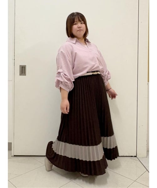 バイカラーのプリーツスカートは総ゴムで履きやすい!少し大きめに作られているので通常4Lサイズの私でもLLサイズで十分でした!プリーツは広がりやすいと思われがちですが、このスカートは少し重みがある分ストンっと下に落ちてくれるので着ぶくれの心配ないです!