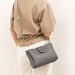 シボ感のある合皮を使ったシンプルなショルダーバッグ。ベルトフラップについたクルミボタンがデザインのポイントになっています。